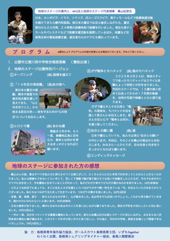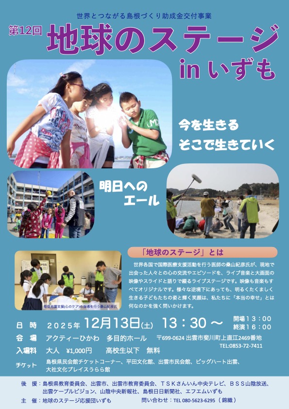 主催: 地球のステージ応援団いずも日時: 2025年12月13日(土)13:30〜会場: アクティーひかわ 多目的ホール内容: 地球のステージ〜特別版対象: 一般の方詳細はこちらから チラシ表 チラシ裏