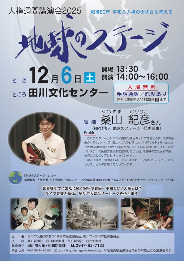 主催: 田川市人権のまちづくり事業推進委員会、田川市・田川市教育委員会日時: 2025年12月6日(土)14:00〜会場: 田川文化センター内容: 地球のステージ対象: 一般の方詳細はこちらから