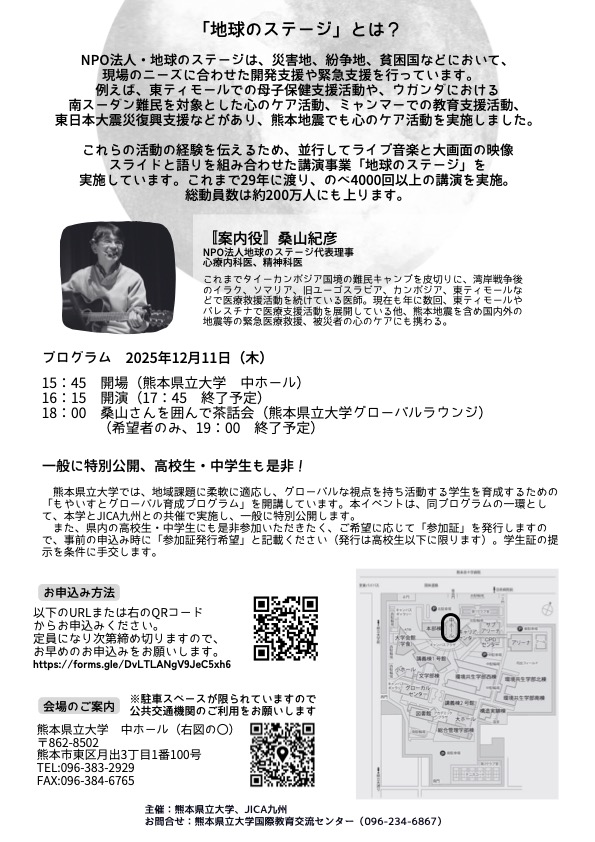 主催: 熊本県立大学日時: 2025年12月11日(木)16:15〜会場: 熊本県立大学内容: 地球のステージ対象: 学生さん、一般の方詳細はこちらから チラシ表 チラシ裏