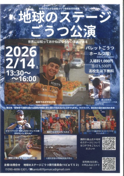 主催: つどぉて52日時: 2026年2月14日(土)13:30〜会場: パレットごうつ 2F ホール内容: 地球のステージ〜特別版対象: 一般の方詳細はこちらから
