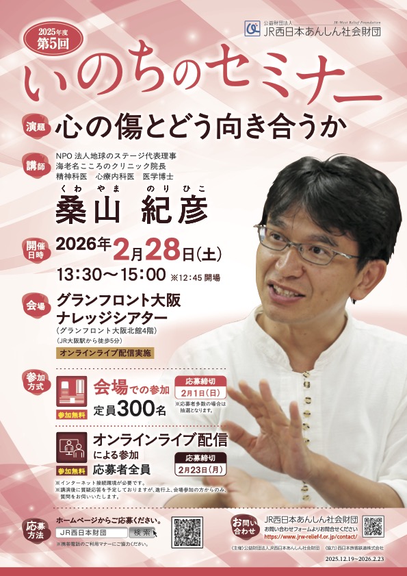 主催: JR西日本あんしん社会財団日時: 2026年2月28日(土)13:30〜会場: グランフロント大阪ナレッジシアター内容: いのちのセミナー「心の傷とどう向き合うか」対象: 一般の方お話のみの「講演」です。会場での対面開催のほか、オンライン配信での参加も可能です。詳細はこちら チラシ表 チラシ裏