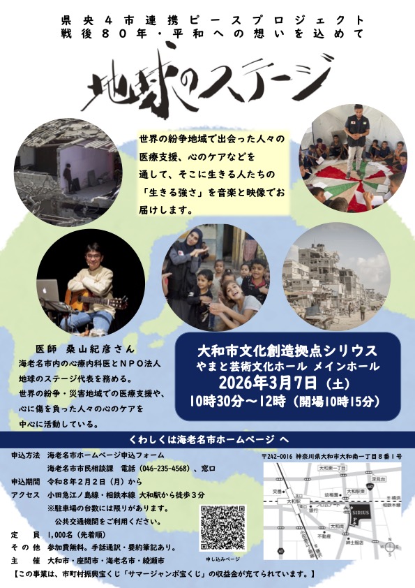 主催: 大和市・座間市・海老名市・綾瀬市日時: 2026年3月7日(土)10:30〜会場: 大和市文化創造拠点シリウス やまと芸術文化ホール メインホール内容: 地球のステージ〜特別版対象: 一般の方入場: 無料(要申込み)詳細はこちらから